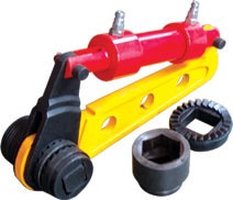 手动高压泵由操纵手柄,高压泵、换向阀、油箱、压力表和带快速接头的输油管等组成。带棘轮式液压扳手由高压油口、液压油缸、曲柄、反力杆、棘轮装置、套筒等组成、前者系动力源部件,后者为扭矩执行机构。